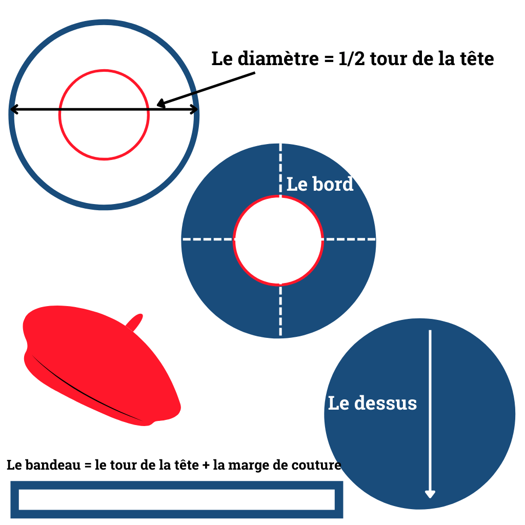 Tout d’abord tracez un cercle dont le diamètre est égal à la moitié de votre tour de la tête. Comment mesurer le tour de la tête? Premièrement, il faut prendre la mesure à l’endroit le plus fort de votre tête qui se situe au milieu du front en général à 1 cm au-dessus des sourcils. Ensuite, gardez la tête bien droite et le ruban à l’horizontal. En générale, le tour de tête des femmes mesure souvent entre 56 et 58 cm et celui des hommes entre 57 et 60 cm.