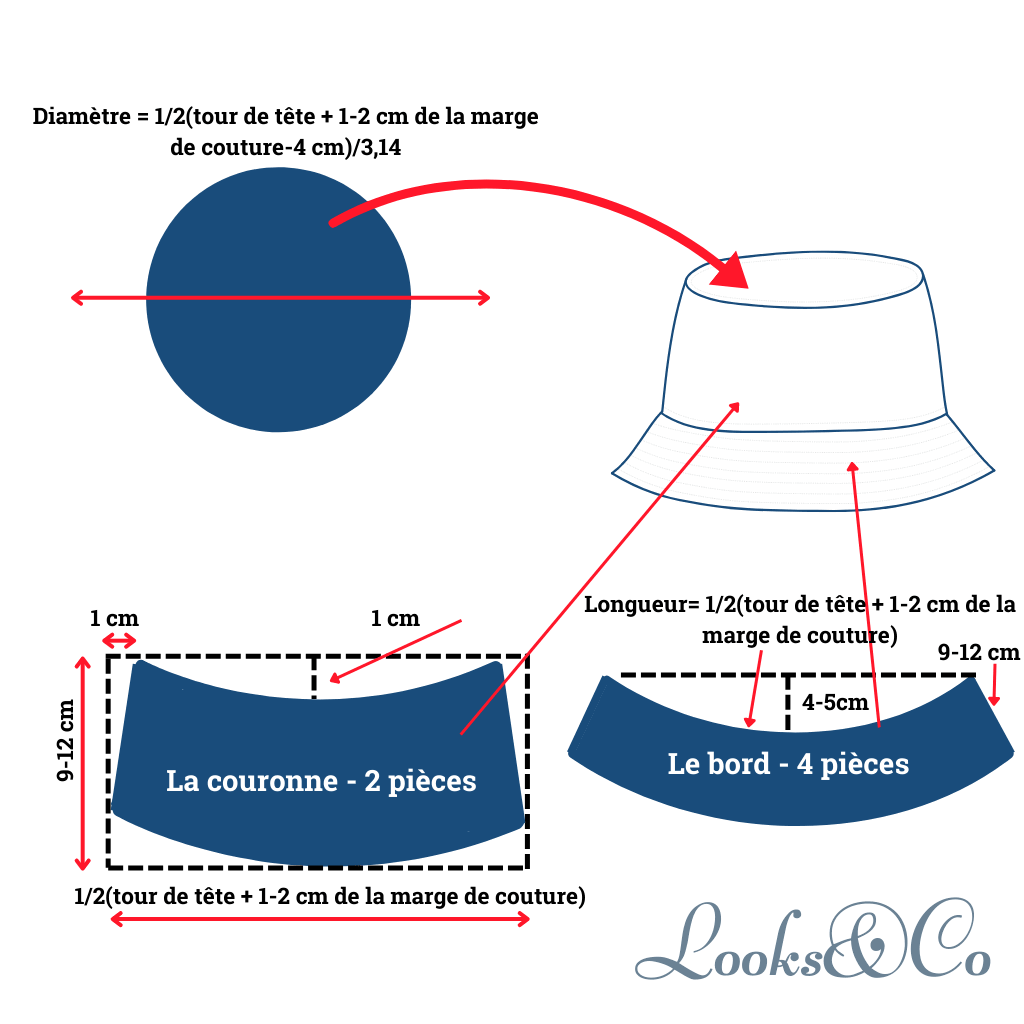 Le fond/dessus – c’est la longueur qui est légèrement inférieure au tour de la tête, à laquelle on ajoute une marge de couture de 1-2 cm (je propose de faire le diamètre du fond/dessus inférieure à 4 cm).