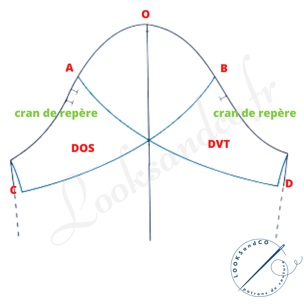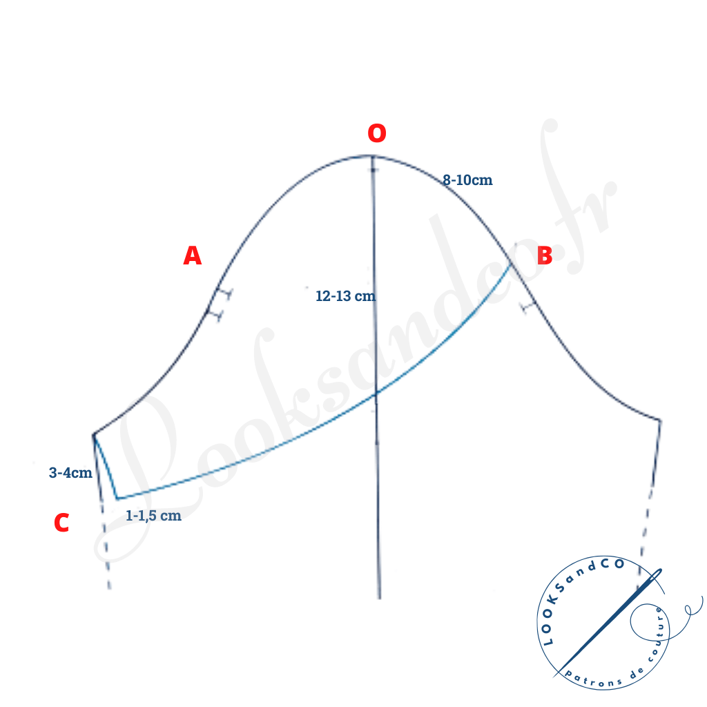 Tracez ensuite l’une des deux ligne de découpe correspondant à l’une des deux parties de la manche. L’autre ligne pour deuxième partie de la manche est identique et vous pouvez l’obtenir par la symétrie. En générale elles débutent au niveau de la carrure DOS.