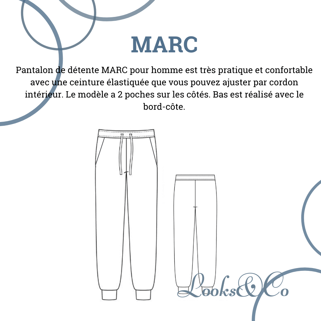 Pantalon de détente MARC pour homme est très pratique et confortable avec une ceinture élastiquée que vous pouvez ajuster par cordon intérieur. Le modèle a 2 poches sur les côtés. Bas est réalisé avec le bord-côte.