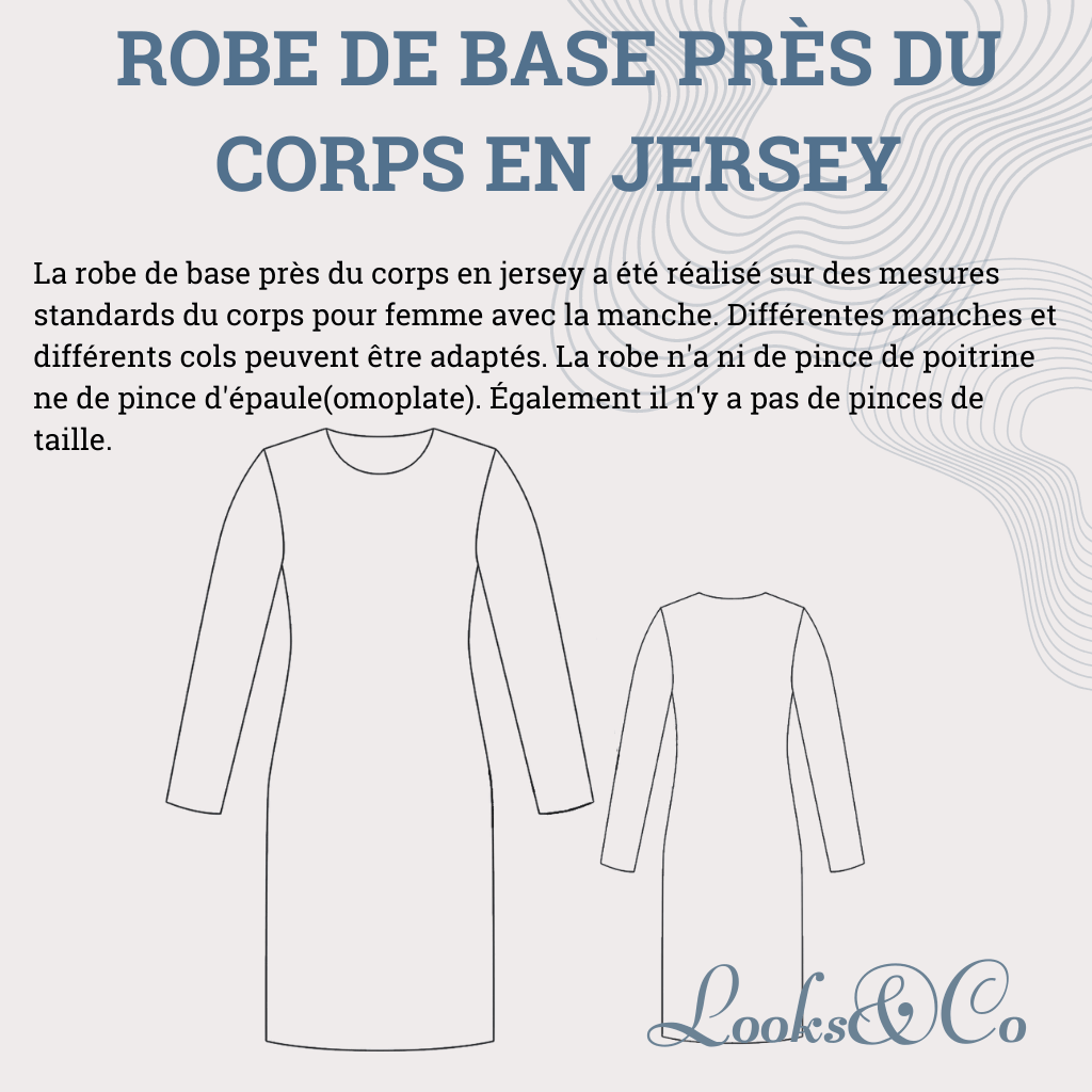 Le patron de la robe de base près du corps en jersey a été réalisé sur des mesures standards du corps pour femme avec la manche. Différentes manches et différents cols peuvent être adaptés.
