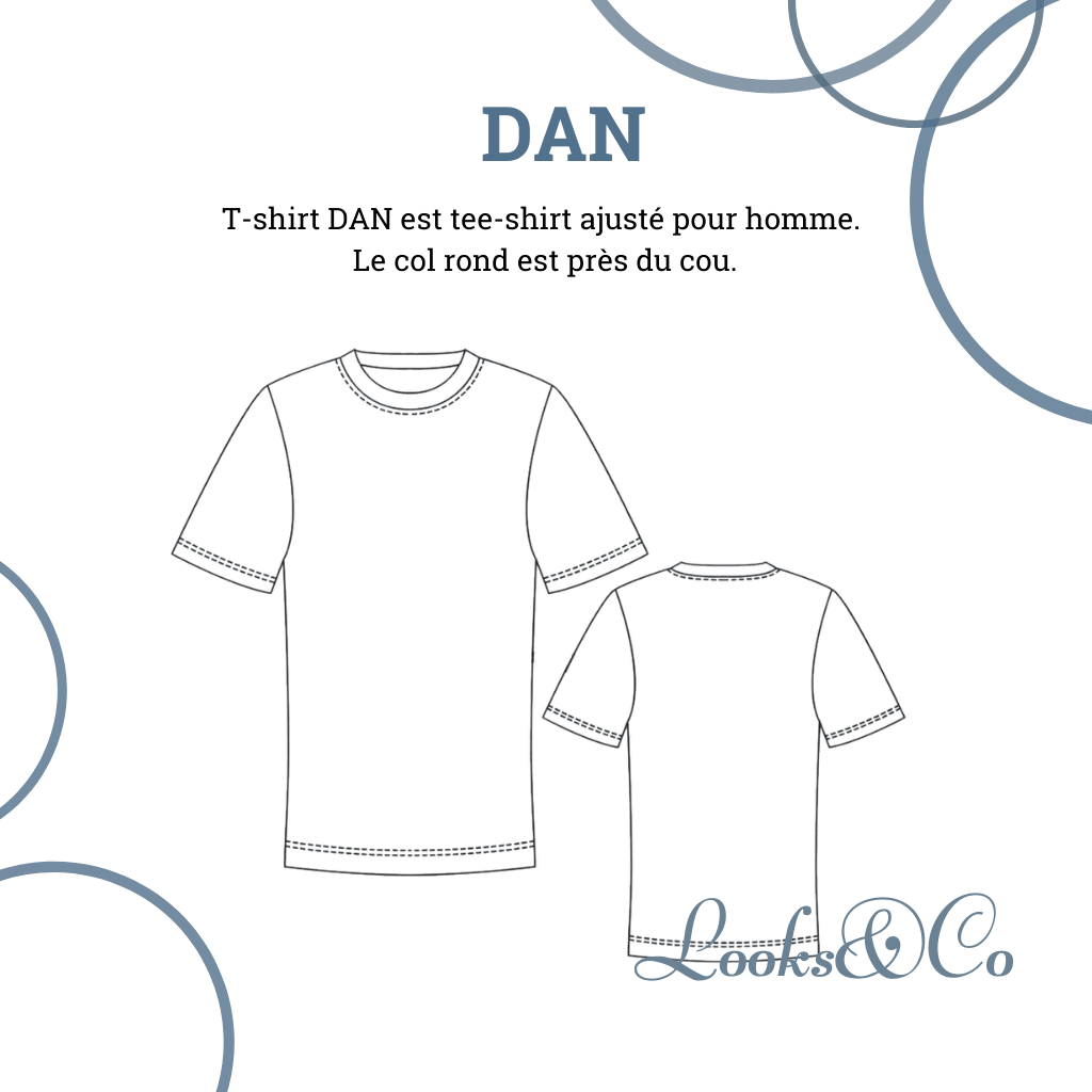 Le patron de t-shirt DAN est un t-shirt idéal pour tous les hommes aimant le style décontracté. C’est un modèle ajusté qui est très confortable. Le col rond est près du cou. T-shirt est agréable à porter et peut être combiner avec un jean ou pantalon MARC ou pantalon SEB ou pantalon LÉO
